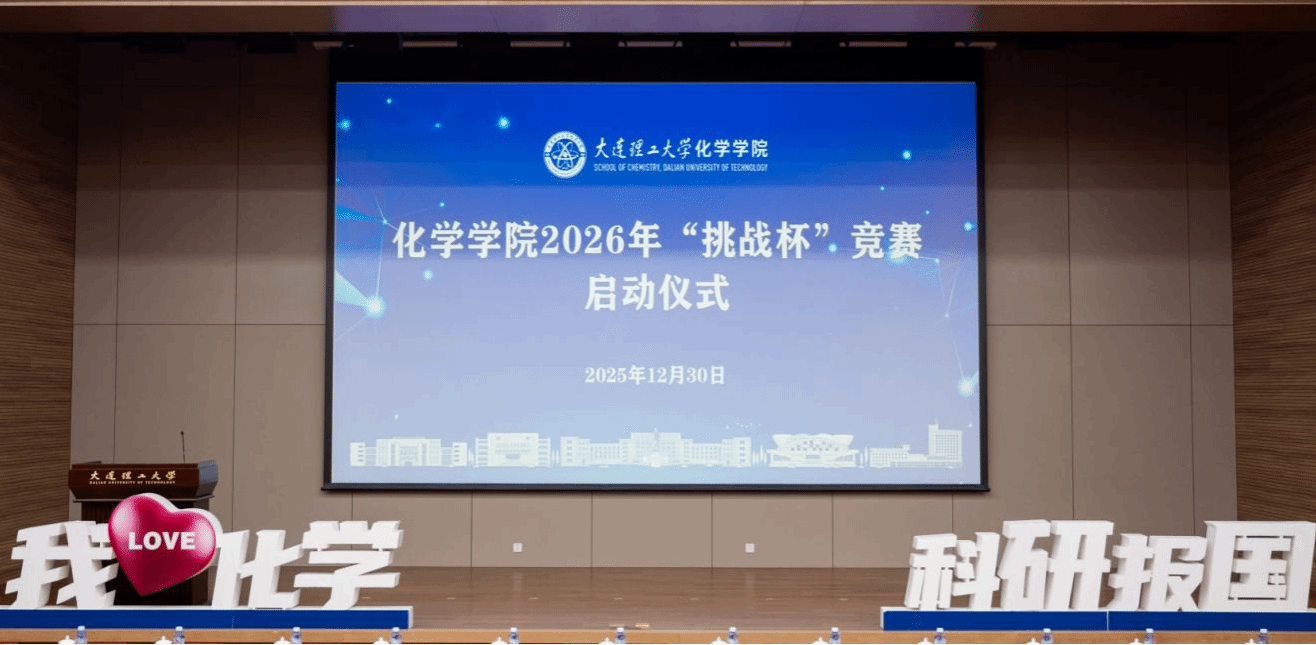 为深入学习贯彻党的二十届四中全会精神,持续深化高层次拔尖创新人才培养,助力化学学科“双一流”建设与学校发展,大连理工大学化学学院于2025年12月30日在伯川图书馆报告厅成功举办2026年“挑战杯”竞赛启动仪式。校团委书记赵显嵩、学院院长陶胜洋、党委书记崔旦以及学院领导班子成员出席仪式。学院全体教师、学生代表参加仪式。启动仪式由党委书记崔旦主持。