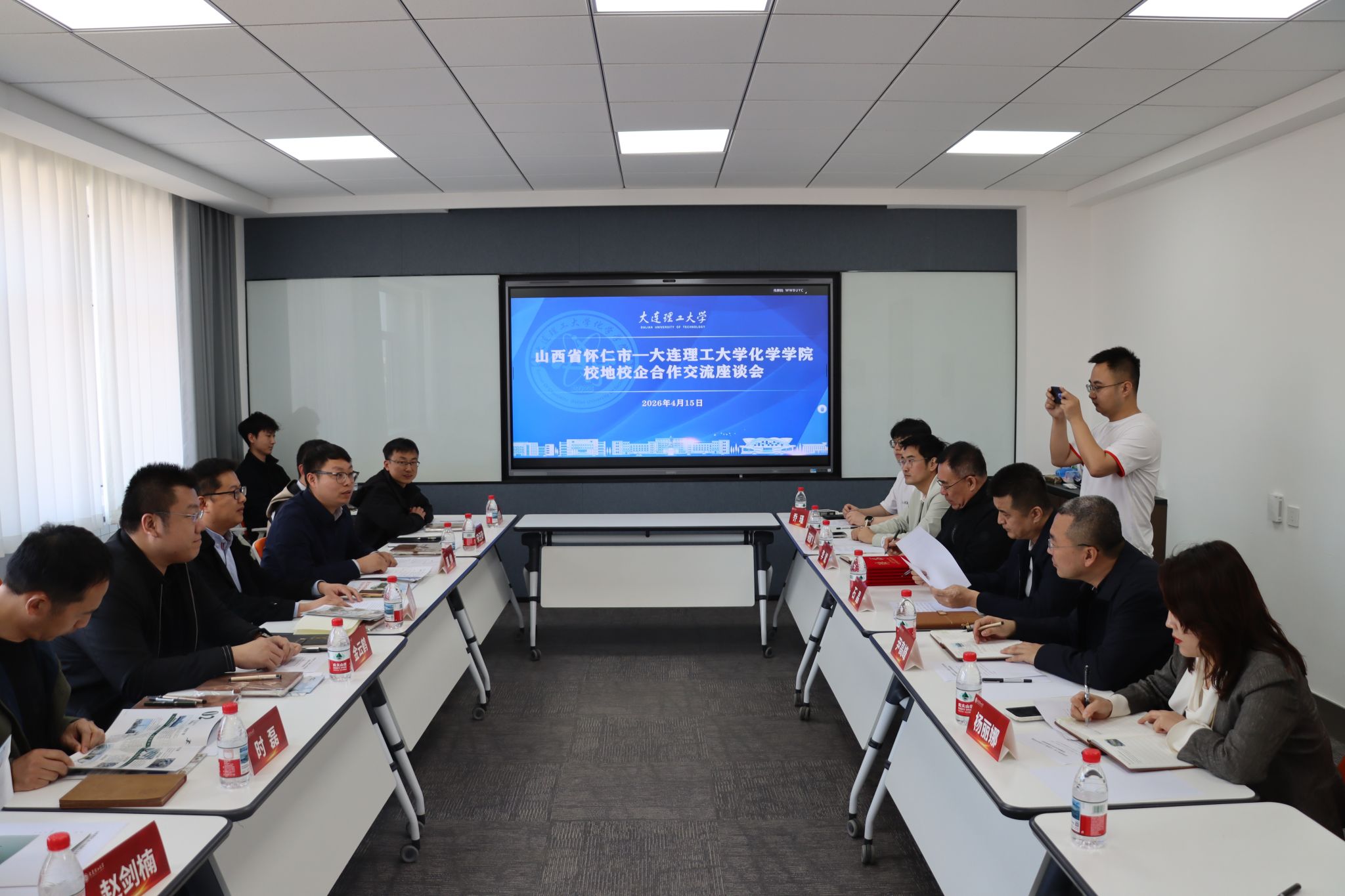 聚焦教育科技人才一体发展,进一步推动化学学院与地方政府、企业合作,2026年4月15日下午,大连理工大学化学学院—山西省怀仁市校地校企合作交流座谈会在海映楼402顺利举办。怀仁市经济技术开发区党工委书记、管委会主任石晶,怀仁市工信局局长尹高峰、市委人才服务中心主任李斌,山西玉龙化工有限公司总经理助理苑鹏飞,怀仁市普惠生物科技有限公司总经理杨丽娜,大连理工大学化学学院副院长王敏、相关教授和专家参加座谈会,会议由化学学院党委副书记、副院长董帅主持。