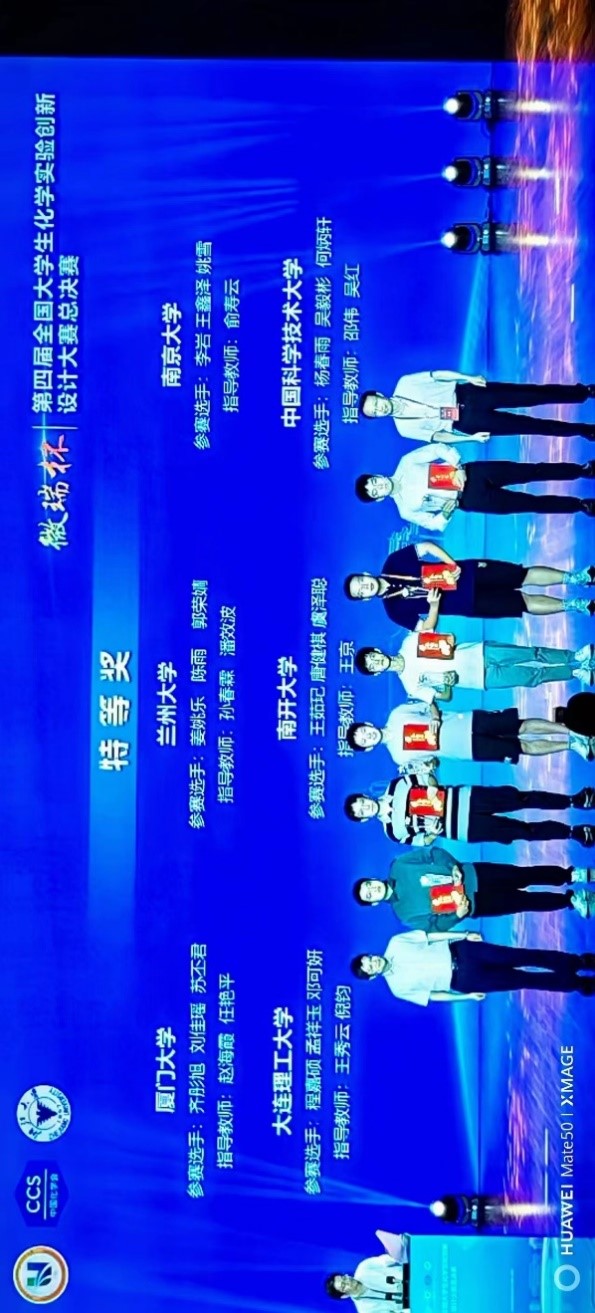 此前于7月4-6日在黑龙江大学举办的东北赛区比赛中,大连理工大学选送的三支队伍中程嘉硕、孟祥玉和邓可妍组成的多彩超铜变变变队(新创实验,指导教师:王秀云、倪钧)和王一鸣、吴浩宇、赵铭宇组成的“EDTA铁钠攻坚”队(改进实验,指导教师:王秀云、宿艳)均荣获东北赛区一等奖,由舒适、张师卓、刘鑫磊组成的“Chem DSSC”(科普实验,指导教师:于泽、潘玉珍)获东北赛区二等奖。多彩超铜变变变队在第一轮小组答辩中排名第一,成功晋级全国总决赛,并斩获特等奖。
