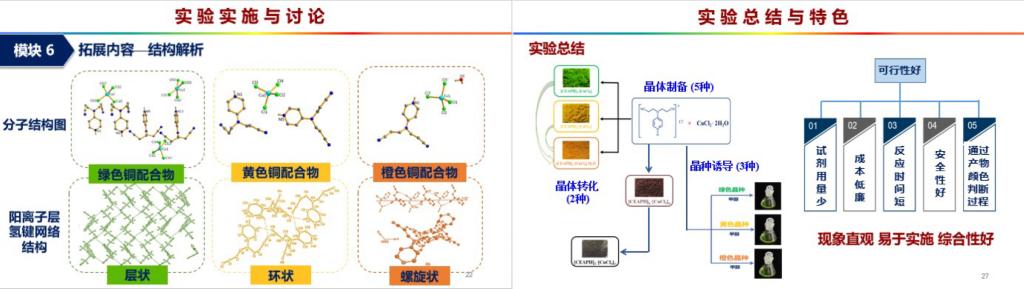 获奖作品为多彩超分子铜配合物制备实验,该实验项目将学科前沿超分子化学理论引入本科实验教学,开创了探讨关于分子间氢键等相互作用的实验内容,以价格低廉的[氮,氮-双(2-氰基乙基)氨基]吡啶盐酸盐(简称CEAP盐酸盐)为配体,通过调控溶剂极性、离子浓度等改变微环境,从而制备具有不同超分子结构的铜配合物。尤其通过Jahn-Teller效应可使得铜配合物具有不同的颜色,从而将复杂的超分子结构具象化和可视化。该新创实验层次化设置了晶体制备、晶体转化、晶种诱导结晶等实验内容,拓增了结构解析内容,实验现象直观、色彩丰富、内容前沿、技术先进,易于实施,是非常理想的本科生教学实验。