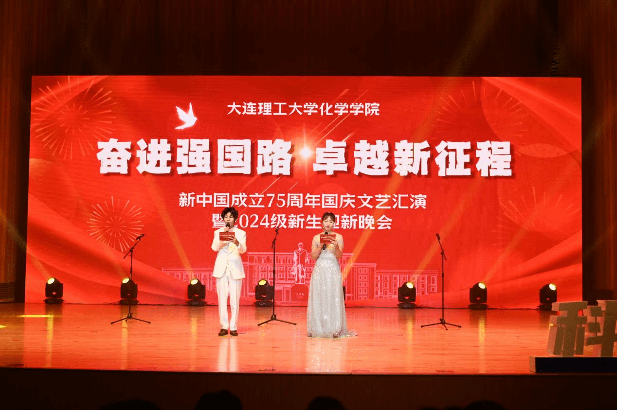 壮美山河,盛世华章,弦歌不辍,献礼祖国。9月29日晚19:00,大连理工大学化学学院“奋进强国路 卓越新征程”新中国成立75周年国庆文艺汇演暨2024级新生迎新晚会于大学生文化活动中心音乐厅隆重召开。化学学院院长陶胜洋教授、党委书记崔旦老师、党委副书记兼副院长黎晓明老师、专业教师代表作为嘉宾出席,学生工作办公室全体辅导员以及化学学院本硕博学生齐聚一堂。晚会由化学学院研究生辅导员谭瑛洁和2024级硕士新生冷吉强共同主持。