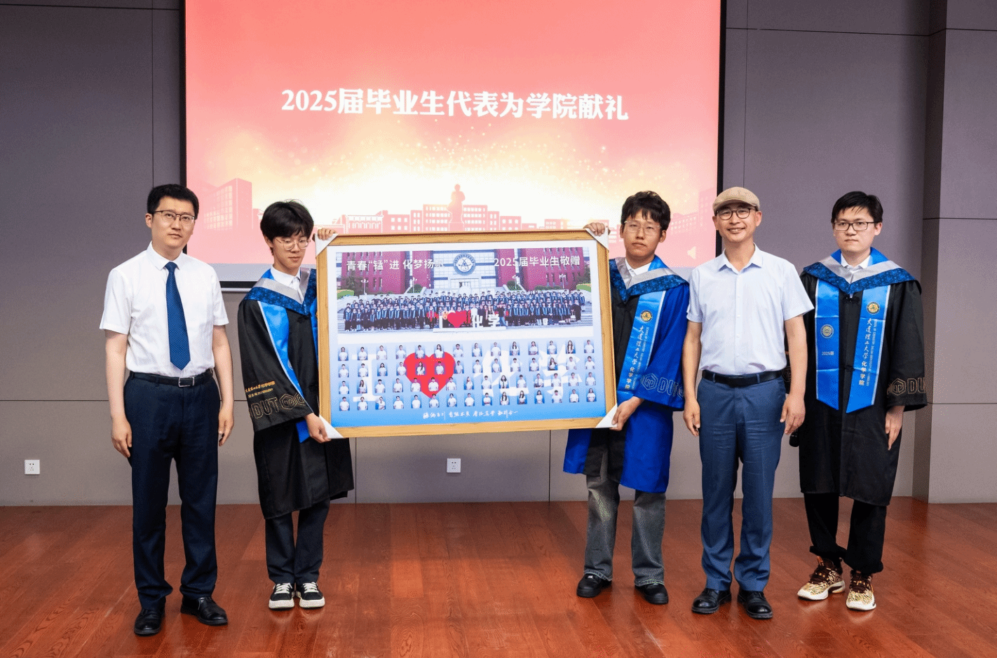 院长陶胜洋、党委书记崔旦代表学院接受2025届毕业生赠送学院的纪念品。同学们用“化学家肖像照”拼缀成“我爱化学”的主题词墙画,表达了毕业生们感恩学院培养,时刻谨记基础学科特色,拔尖人才培养,用化学服务国家建设的志向。