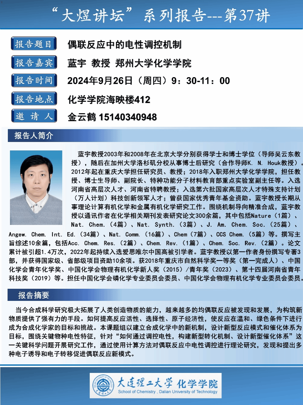 主讲人简介:蓝宇教授2003年和2008年在北京大学分别获得学士和博士学位(导师吴云东教授),随后在加州大学洛杉矶分校从事博士后研究(合作导师K. N. Houk教授)。2012年起在重庆大学担任研究员、教授;2018年入职郑州大学化学学院,担任教授、博士生导师、副院长、特种功能分子材料教育部重点实验室副主任等。入选河南省高层次人才、河南省特聘教授;入选第六批国家高层次人才特殊支持计划(万人计划)科技创新领军人才;曾获国家优秀青年基金资助。蓝宇教授长期从事理论计算有机化学和金属有机化学研究工作。围绕机制导向精准合成,蓝宇教授以通讯作者在化学相关期刊发表研究论文300余篇,其中包括Nature(1篇)、Nat. Chem.(4篇)、Nat. Synth.(3篇)、J. Am. Chem. Soc.(25篇)、Angew. Chem. Int. Ed.(34篇)、Nat. Comm.(16篇)、Chem(7篇)、CCS Chem.(5篇)等。撰写主旨综述10余篇,包括Acc. Chem. Res.(2篇)、Chem. Rev.(1篇)、Chem. Soc. Rev.(2篇)。论文累计被引超1.4万次,2022年起持续入选爱思唯尔中国高被引学者。蓝宇教授以第一作者身份撰写专著3部,并获得国家级、省部级项目资助10余项。获2018年重庆市自然科学奖一等奖(第一完成人)、中国化学会青年化学奖、中国化学会物理有机化学新人奖(2015)/青年奖(2023)、第十四届河南省青年科技奖(2019)等。担任中国化学会磷化学专业委员会委员、中国化学会物理有机化学专业委员会委员。