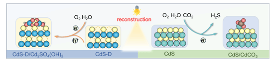 基于这一背景,大连理工大学王敏教授、王新葵教授和陶胜洋教授合作系统地研究了CdS在O2存在体系中CO2RR的光腐蚀过程,通过引入缺陷来调控CdS的晶粒尺寸,从而控制其重构过程,以提高对氧气的耐受性。对于纯CdS材料,析氢反应(HER)速度较慢,积累的质子会导致酸性腐蚀,并生成CdCO3物种,从而降低CO2RR的活性。而对于有缺陷的CdS(CdS-D)材料,HER反应速度快,积累的空穴会将硫化物氧化为Cd2SO4(OH)2物种(图1),将进一步增强对CO2的吸附,提高催化性能。当氧气含量达到空气水平(23%)时,CdS-D的催化性能与纯CO2时保持一致,经过多次循环后,CO的生成速率提高到5.12 mmol g-1 h-1,这是由于Cd2SO4(OH)2的生成进一步促进了对CO2的吸附,抑制了O2的吸附,使CO2RR优于ORR发生。