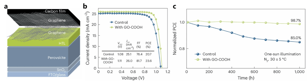 研究团队采用羧基功能化的氧化石墨烯(GO-COOH)作为Spiro-OMeTAD的p型掺杂剂,GO-COOH与Spiro-OMeTAD之间发生电子转移,其独特的离域电子结构能够在无需氧气暴露的条件下实现Spiro-OMeTAD高效快速的p型掺杂,从而在空穴传输层与碳电极之间构建了一个强π-π共轭的理想界面,极大地减少了界面电荷传输动力学损失,该掺杂策略表现出优异的可重复性,结合叠合式双碳电极结构实现了23.6%的C-PSCs世界最高效率,并获得第三方中国计科院的权威认证。同时,研究发现HTL中Li+能够插入GO-COOH层间形成牢固的Li-C键,从而“锁住”这些可能损害电池长期稳定性的离子,未封装的电池在连续光照1000小时后仍保持98.7%的初始效率,从根本上提升了器件的运行寿命。该项研究成果成功地缩小了碳基钙钛矿太阳能电池与金属电极器件的性能差距,同时保留了其低成本、高稳定性的核心优势。