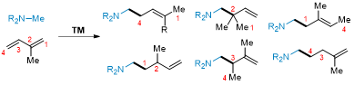 利用简单易得的二烯、炔烃或烯烃等原料通过氢氨基烷基化反应制备高烯丙基胺已被证明是一种有效策略。然而,该反应仍面临区域选择性控制的严峻挑战。以异戊二烯为例,由于其电子结构缺乏明显极性,在偶联反应中可能经历多种不同的加成路径,导致产物分布难以调控(图1)。因此,如何在选择性模式下实现非活性二烯烃的氢氨基烷基化反应,目前仍存在实质性难题。