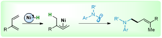 近日,大连理工大学化学学院石磊教授课题组提出了一种镍/光氧化还原双催化1,3-二烯烃的氢氨基烷基化反应。工业原料异戊二烯及其衍生物被用作烯丙基亲电试剂替代品,它们与光氧化还原产生的α-氨基烷基物种偶联,有效地产生有价值的高烯丙基胺。