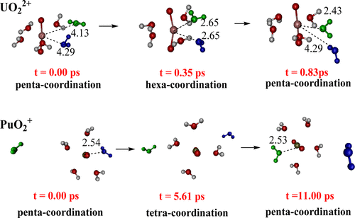 Figure1. Representative snapshots to elucidate the water exchange mechanism of UO22+ and PuO2+. The incoming water was colored in green, and the leaving one in blue. The other dications and monocations showed similar behavior as uranyl(VI). Key distances (in Å) were also shown.