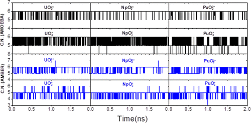 Figure 2. Coordinate number (CN) of actinyl–tricarbonate complexes as a function of simulation time by using the AMOEBA (top, in black) and the AMBER (bottom, in blue) force fields, respectively. The cutoff used to calculate CN was 3.0 Å.