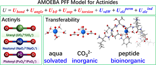 锕系元素化学的理解对于核能技术的发展至关重要。其中,线性的锕酰离子 [AnO₂]ⁿ⁺ (An = U, Np, Pu; n = 1, 2) 是其在水溶液环境中的重要存在形式,并展现出丰富的配位化学性质。然而,受限于其放射性与化学毒性,实验研究面临挑战。因此,分子动力学模拟成为了在分子层面研究其行为的重要工具。模拟的准确性极大程度上依赖于描述原子间相互作用的力场的可靠性。传统的非极化力场难以同时精确描述结构、热力学和动力学性质,特别是对于高电荷的锕系离子,多体极化和电荷转移效应不可忽略。发展能够精确捕捉这些效应的可极化力场,是开展锕系溶液动力学模拟研究的迫切需求。