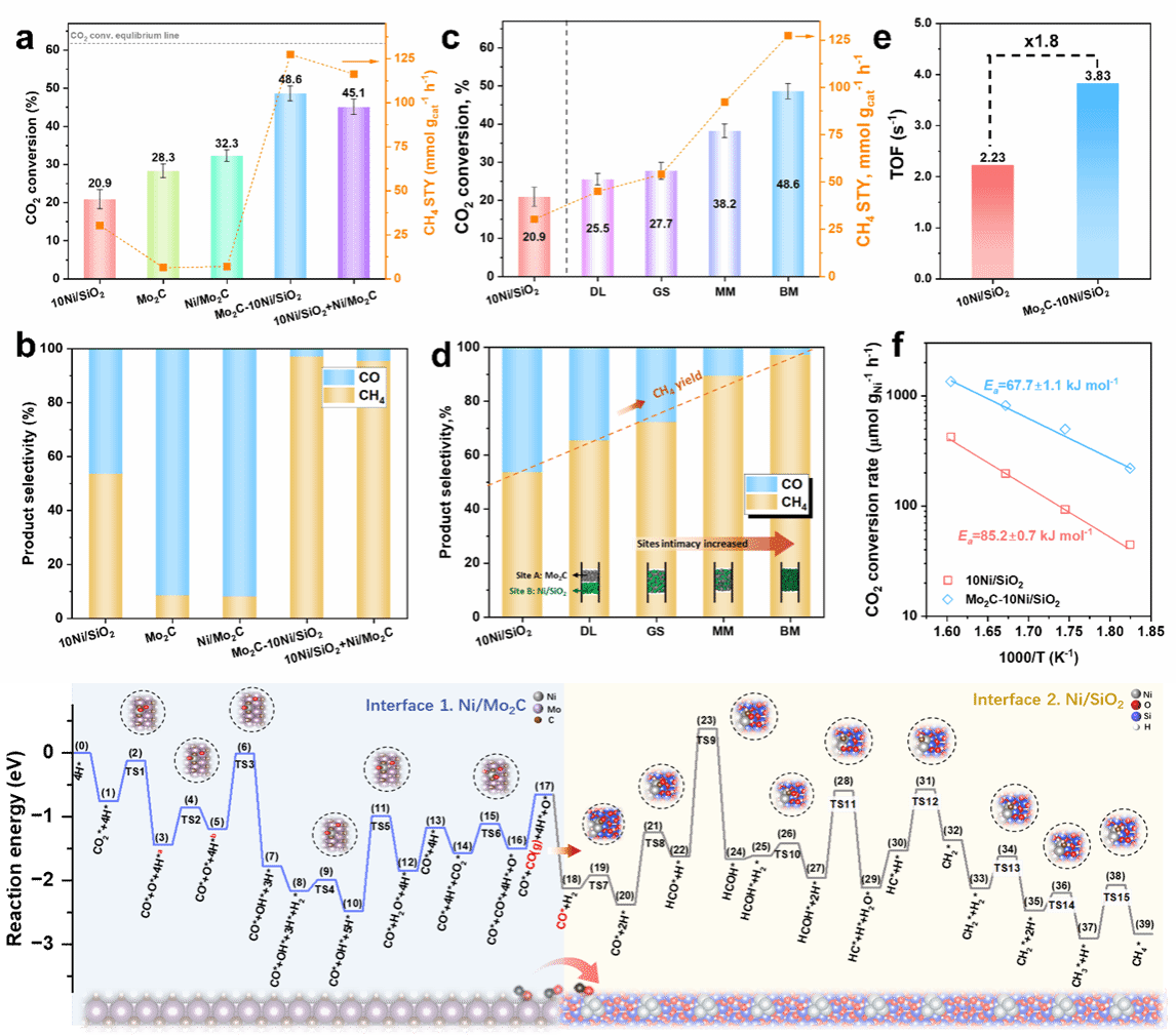 研究团队以Ni/SiO2和Mo2C为模型体系,发现在一定温度与还原气氛下,镍纳米粒子可以从惰性SiO2表面“迁移”至Mo2C表面,并发生显著的再分散,形成尺寸更小的Niδ+物种。这种迁移的驱动力源于镍与碳化钼间更强的化学相互作用。通过系统研究碳源、混合方式、气氛和温度等参数,团队揭示了调控这一迁移过程的关键因素。基于上述定向迁移机制,研究者成功构建了Ni/Mo2C-Ni/SiO2双界面催化剂。在CO2加氢反应中,该催化剂表现出卓越的性能:与Ni/SiO2或Ni/Mo2C参比剂相比,双界面催化剂能将产物选择性的几乎完全转向甲烷,同时CO2转化率提升一倍以上。甲烷生成速率达到127 mmol g-1 h-1,分别是Ni/SiO2和Ni/Mo2C催化剂的4.2倍和18.1倍。