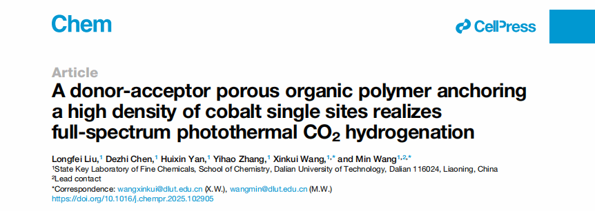该工作以“A donor-acceptor porous organic polymer anchoring a high density of cobalt single sites realizes full-spectrum photothermal CO2 hydrogenation”为题,发表在《Chem》上。论文系统揭示了单原子光热催化体系中红外光利用与反应性能之间的内在联系,为太阳能驱动CO2转化研究提供了重要参考。本文的通讯作者是大连理工大学化学学院王敏教授和王新葵教授,第一作者是大连理工大学2023级硕士生刘龙飞,大连理工大学为唯一完成单位。