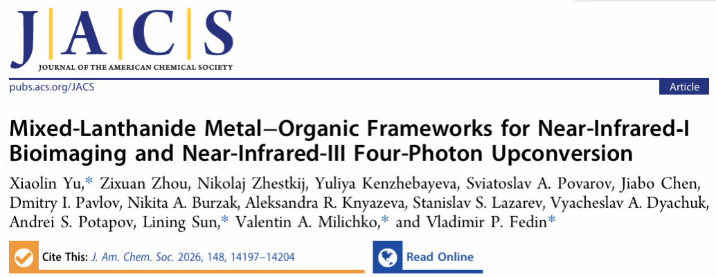 上述工作以“Mixed-Lanthanide Metal–Organic Frameworks for Near-Infrared-I Bioimaging and Near-Infrared-III Four-Photon Upconversion”为题发表在《J. Am. Chem. Soc.》上。本文的第一作者为于晓林副教授,大连理工大学于晓林副教授、上海大学理学院孙丽宁教授、新乌兹别克斯坦大学Milichko副教授、俄罗斯科学院西伯利亚分院无机化学研究Fedin教授为共同通讯作者。大连理工大学为第一完成单位。