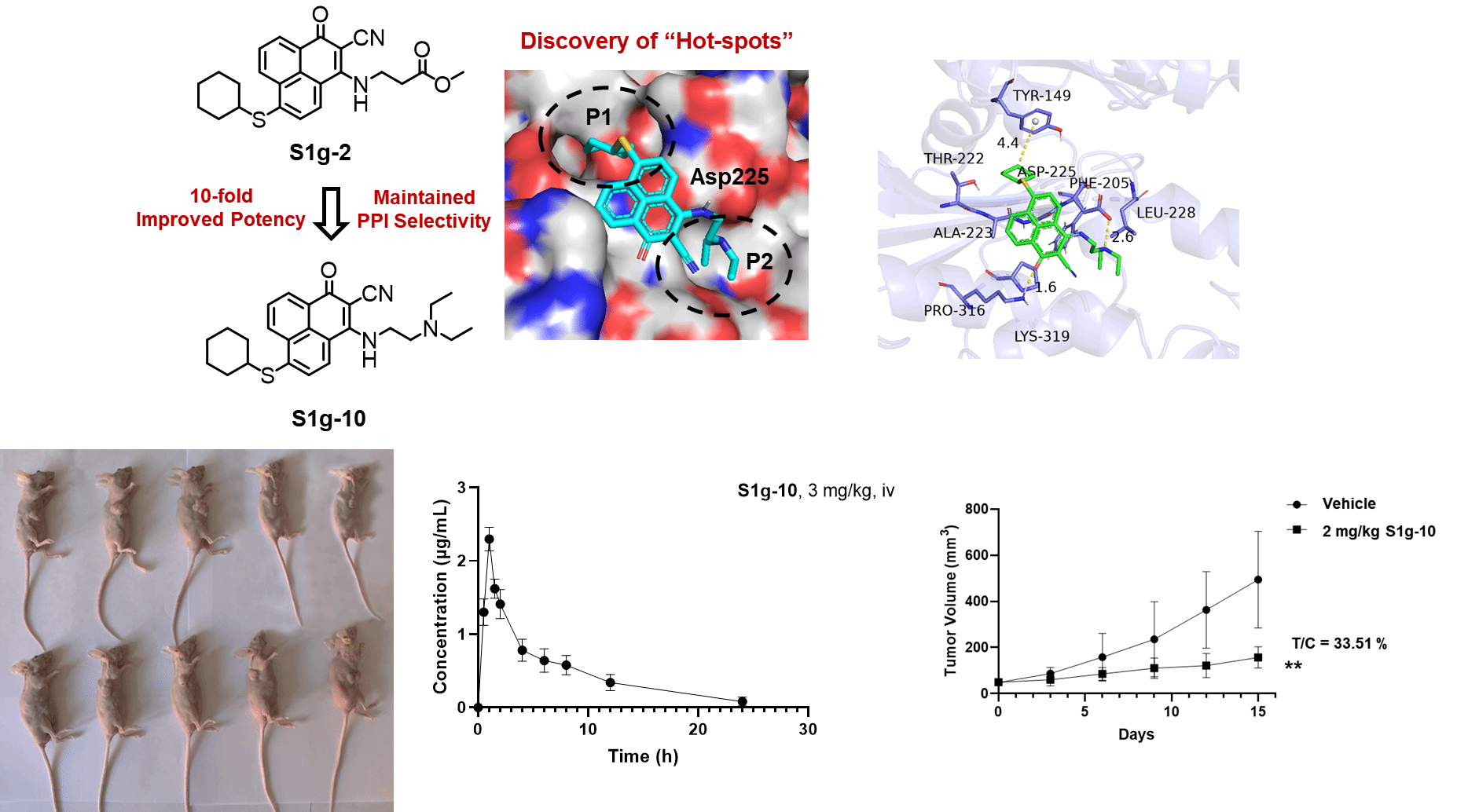 本研究继续了药化和药理的研究工作。研究团队以S1g-2和Hsp70蛋白的结合模式为基础,设计合成了一系列具有更高活性、更优成药性的抗癌药物先导分子,实现分子“Hit to Lead”优化。通过对衍生物分子进行构效关系分析(SAR),结合二维核磁(TROSY-HSQC)、分子动力学模拟(MD)和氨基酸定点突变等结构生物学、计算生物学手段,揭示了Hsp70/Bim结合界面上的“热点残基”(hot-spots),阐明了小分子阻断Hsp70/Bim PPI的结构基础。所获得的最优产物S1g-10(6-环己基巯基-3-((2-(二乙基氨基)乙基)氨基)-2-氰基-非那烯-1-酮),抗癌活性相比原分子S1g-2提高了10倍,在动物模型中对3代激酶抑制剂治疗耐药的CML达到70%以上的抑瘤率,并表现出良好的药代参数和治疗安全性。这项工作不仅获得了一个更具潜力的治疗CML的抗癌先导药物,还为新的靶向抗癌药的研发提供了设计策略。