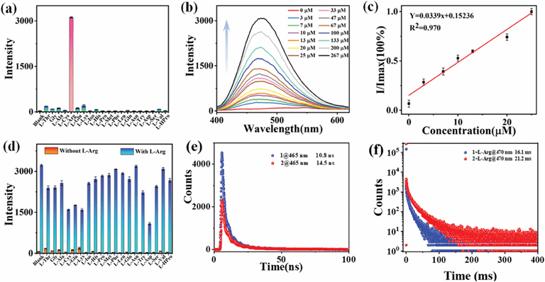图4(a)1在MeCN悬浮液中对各种氨基酸的延迟发光强度的比较。(b)分散在0–0.27 mM范围内的L-Arg/ MeCN溶液中的1悬浮液的发射光谱。(c)470 nm处的发光强度(I/Imax)与L-Arg浓度之间的线性关系。Imax是添加27µM L-Arg时的延迟发射强度。(d)当具有或不具有0.27mM L-Arg时,1的悬浮液中干扰物的发光强度的比较。(e)1和2的悬浮液的465 nm瞬态发射的衰变曲线。(f)1+l-Arg和2+l-Arg的悬浮液的470nm延迟发射的衰变曲线。