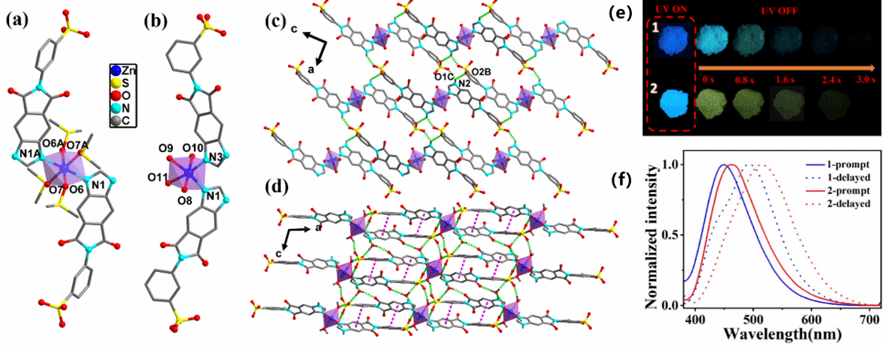 1是具有反式构型的单核结构,每个Zn原子采用八面体{N2O4}配位模式,将单核配合物连接成2D层状结构,这些层通过来自相邻层的未配位的咪唑氮原子和磺酸氧原子之间的氢键进一步连接成3D超分子结构。2也具有单核结构。6配位的Zn2+离子具有扭曲的八面体配位环境,该配合物具有顺式结构。每个配合物分子的四个配位水分子与两个相邻配合物的两个磺酸基之间存在强氢键,在苯并咪唑环与相邻分子之间可以观察到偏移的面对面π··π相互作用,这些弱相互作用将分子连接成稳定的3D超分子结构。(图2)1在365nm紫外光下具有深蓝色发光,关闭紫外光后呈现持续约3s的蓝绿色余辉。2在相同条件下显示持续约2.4秒的黄绿色余辉。