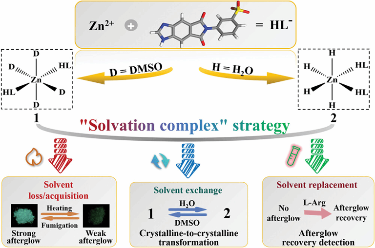 近日,大连理工大学张建军教授团队在Advanced Functional Materials发表了题为“Coordinated Solvent Molecules Enable the Excellent Capabilities of Two Zn2+-Based Complexes in Detecting l-Arginine via Long-Lived Luminescence Recovery”的研究论文。在这项工作中,采用“溶剂化配合物”策略制备了两种新型的多配位溶剂余辉配合物,即具有延迟荧光(DF)和室温磷光(RTP)的反式配合物1和具有RTP的顺式配合物2。它们可以作为选择性检测L-精氨酸的恢复型LLP,检测限低至1.0×10-7 M。此外,H2O/DMSO蒸汽熏蒸会导致1和2之间的可逆晶体结构转变。详细的机制研究表明,配位溶剂的变化,包括损失/获取、交换或置换,在这种余辉多刺激响应特性中起着关键作用。这项工作不仅展示了这种长寿命发光配合物在恢复型检测方面的潜力,还揭示了溶剂化配合物在制备余辉多刺激响应材料方面的独特优势。