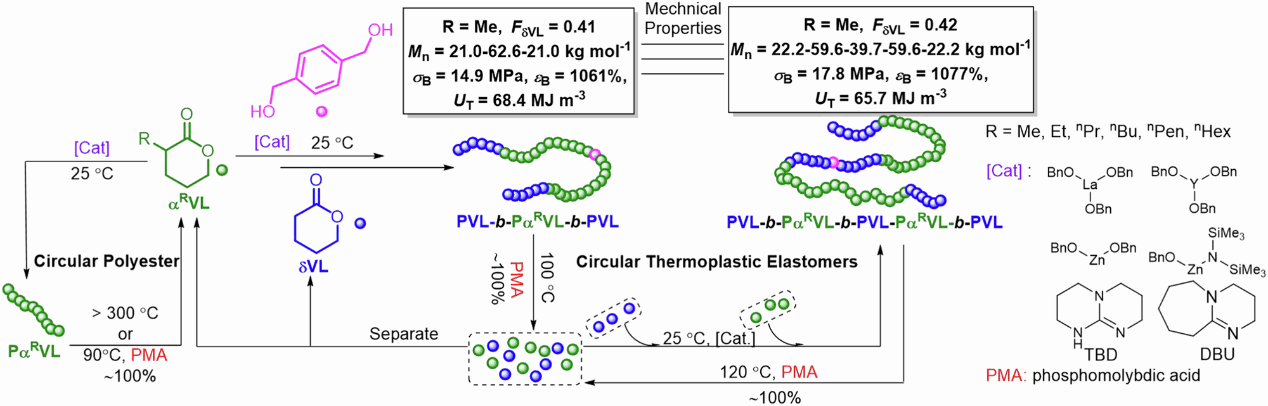 近年来,为了避免石油基聚合物带来的“白色污染”,可化学循环聚合物得到了快速发展,大量的可化学循环热塑性塑料被开发出来,然而,完全可化学循环的热塑性弹性体(TPE)的研究仍处于空白。随着TPE市场规模的大幅增长,为了避免塑料污染问题的再次发生,迫切需要设计具有完全化学可回收性的TPE,然而,这需要面临以下三方面的挑战:1)产生的新型可化学循环TPE需要与商品化TPE性能相当;2)产生的新型可化学循环TPE能选择性地完全解聚为纯净的聚合前体;3)建立有效的聚合方法直接转化回收(避免额外的分离纯化)的单体混合物为新的、性能优于原TPE的可化学循环TPE。