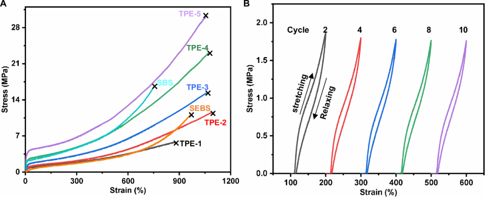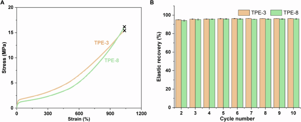图3. TPE- 3 tri-BCP和TPE-8 penta-BCP拉伸性能的比较