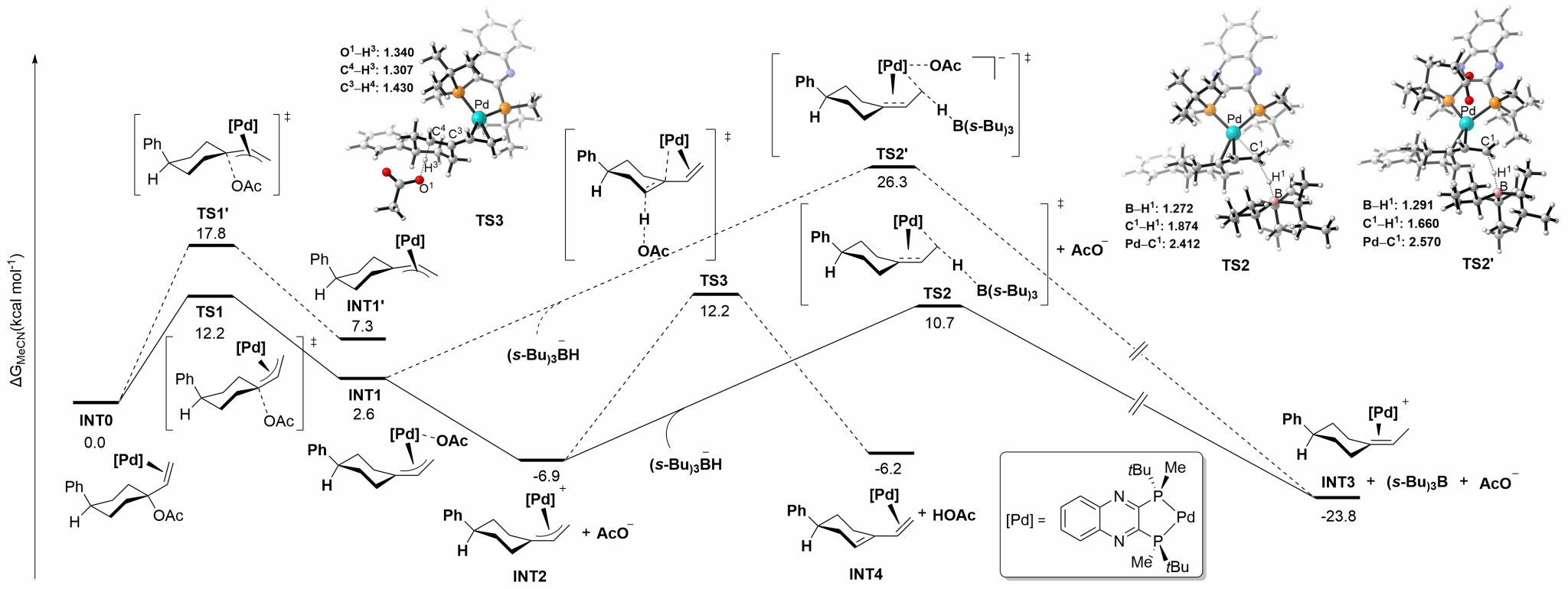 相关机理研究证明𝜂3-烯丙基钯中间体的形成是该反应的对映选择性决定步骤,此外,在该反应条件下氢解途径为能量最低的最优途径,有效避免了消除副产物的生成。