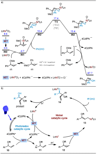 石磊教授团队开发了一种光氧化还原和镍双催化体系,成功实现了烯丙基醚中三级C-H键的选择性官能化。该工作的亮点:1)该方法对多种官能团具有良好的耐受性,底物适用范围广泛,具有优异的对映选择性(最高至 99% ee)和非对映选择性(最高至 20:1 dr)。2)机理实验和密度泛函理论(DFT)研究表明,烯丙基-Ni(II)物种在与醛类化合物的羰基偶联反应过程中起着亲核试剂的作用。3)反应过程中,LnNiII经历单电子转移(SET)原位还原为LnNiI物种,并迅速捕获烯丙基自由基形成LnNiII-烯丙基复合物,该复合物与苯甲醛配位。其中,转化决速步为亲核加成,且符合Zimmerman-Traxler模型。随后生成的镍烷氧化物由质子化断裂NiII-O键转化为多样的邻二醇重要骨架。4)尽管E/Z异构化的转化能垒仅为9.1 kcal/mol,但Z异构体比E异构体热力学上稳定3.4 kcal/mol,因此在反应中Z-异构体是主要物种。
