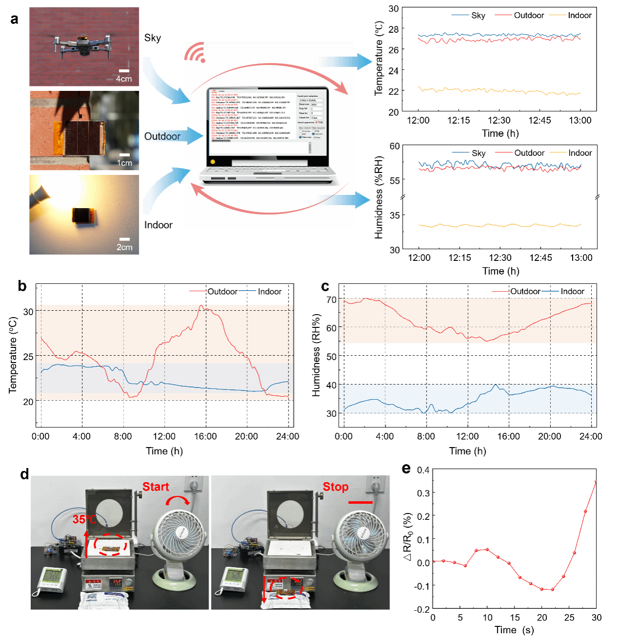 作者展示了FPSM-SSN系统在不同环境中的网络化监测能力,包括室内、室外和无人机上的应用。系统在这些位置实现了对温度和湿度的稳定、准确的网络化监测。此外,图5b,c还展示了FPSM-SSN系统在24小时内的长期网络化监测能力,其测量结果与官方天气报告高度一致,表明系统在不同环境中的可靠性和精度。最后,图5d,e还展示了FPSM-SSN在智能家居控制中的应用潜力,通过与数字开关集成,系统能够根据环境温度变化自动控制家用电器,如电风扇,从而实现智能家庭控制。