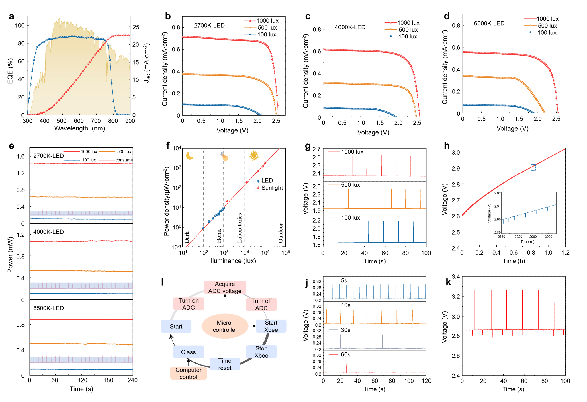 当前全球物联网(IoT)节点数量已达170亿,主要依赖电缆或电池供电,导致高维护成本及断电时数据丢失风险。自维持物联网节点虽能解决上述问题,但面临能源供应不稳定、能量利用效率不足等挑战。钙钛矿太阳能电池(PSCs)因其可调带隙、高吸收系数及优异的低光环境效率(理论值达60%),成为适配多变光照条件的理想能源方案。然而,现有光伏系统在复杂环境(如室内弱光、阴雨天气)下的稳定供电能力不足,且缺乏集成传感、储能与无线传输的高度整合系统,阻碍了自维持IoT节点的实用化发展。