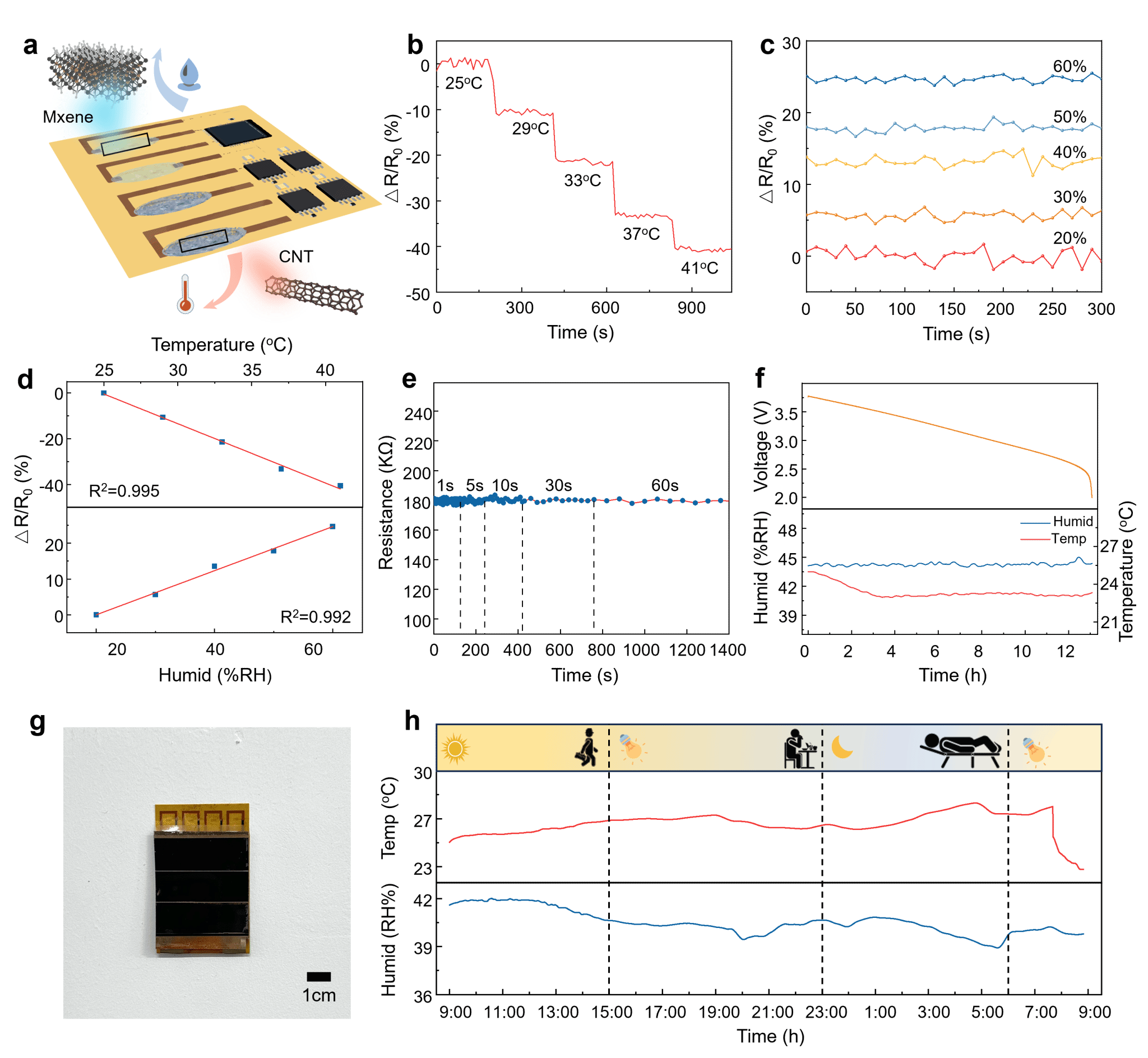 研究中开发了两种基于PEDOT:PSS的电阻性传感器,分别用于温度和湿度检测。这些传感器可以通过喷墨打印技术与SSN模块无缝集成。在夜间无光照条件下,FPSM-SSN能够在30秒的传输间隔下保持低功耗信息采集,并通过电容器模块实时监测电压值,实现了长达13小时的夜间自给式检测。这些结果表明,FPSM-SSN系统在智能家居和智能城市应用中具有稳定、准确的自给式信息采集能力。