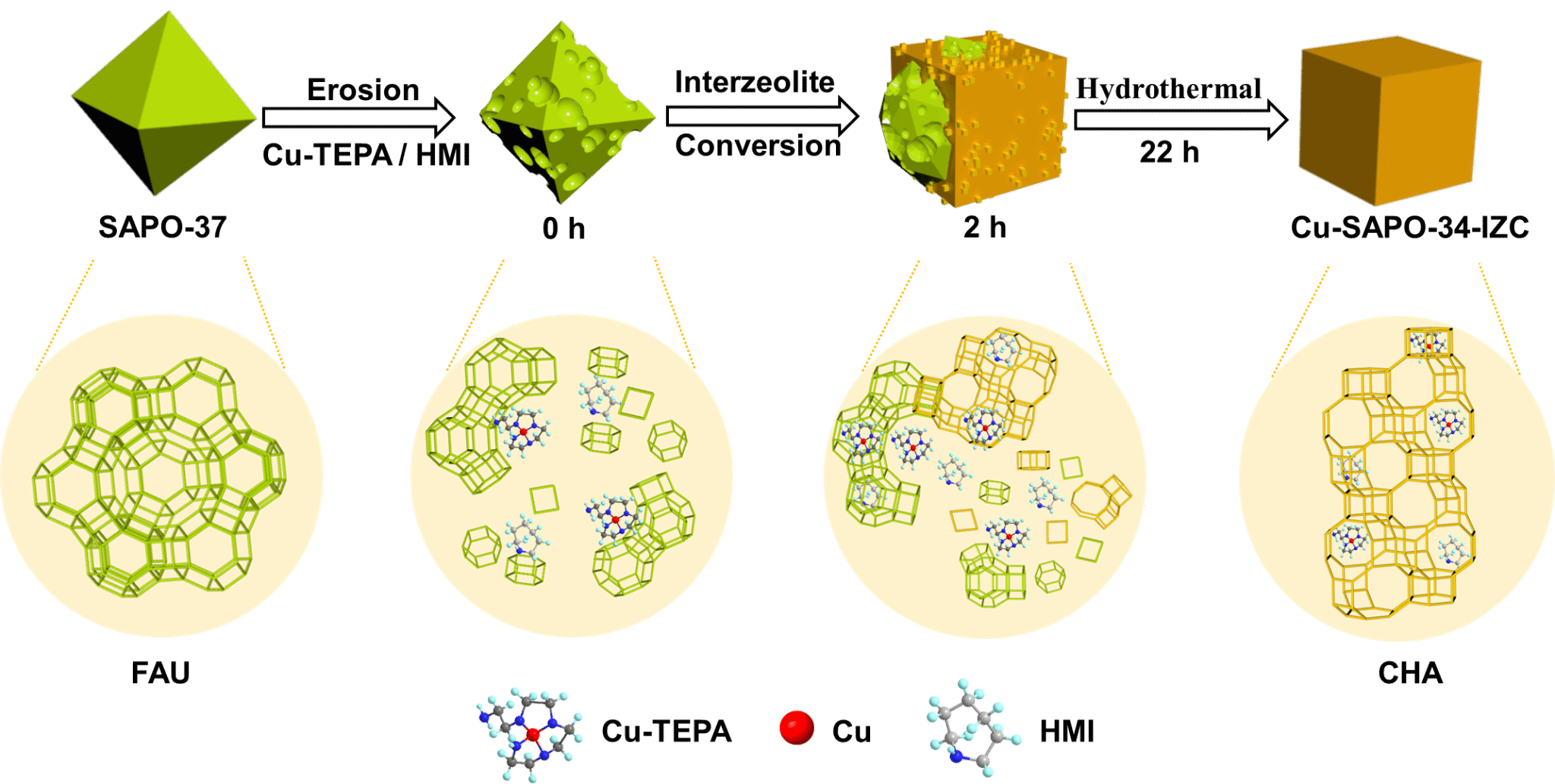 通过表征证明母体沸石SAPO-37首先在碱性模板剂的作用下溶解形成基本结构单元,而后在Cu-TEPA的引导下,结构单元重组并形成初步的CHA结构,随着时间延长Cu–TEPA逐步掺入CHA笼内,并最终形成高结晶度的Cu-SAPO-34沸石。(图3)
