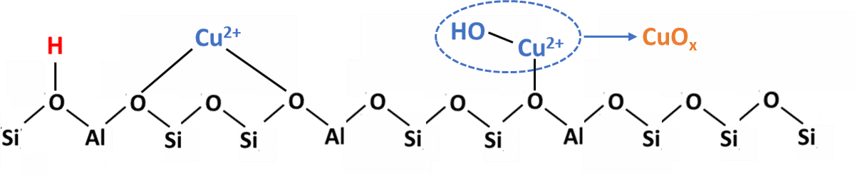 氨的选择性催化还原(NH3-SCR)是有效减缓有害氮氧化物排放的关键技术。含铜的小孔沸石因其优异的稳定性及较宽的温度窗口而受到广泛的关注。Cu-SAPO-34为Si-P-Al骨架连接形成的CHA拓扑结构,其合成成本较低,同时还具有优异的高温水热稳定性。然而,优化Cu-SAPO-34中的硅分布仍具有挑战。硅的分布对于实现沸石中酸性位点与活性铜物种之间的协同作用至关重要。沸石中孤立的硅物种有助于形成适宜的酸性位点,同时孤立硅物种更有利于形成并稳定Cu2+活性位点(图1),这些Cu2+物种是反应的活性中心。相反,如果形成大量的硅岛,既难以提供反应所需的酸性,又会形成Cu(OH)⁺物种(图1),而Cu(OH)⁺物种稳定性较差,易发生水解,进而对反应活性产生负面影响。目前,对于Cu-SAPO-34的合成主要集中于离子交换法和一锅法,二者对于Si分布的调控仍存在问题,因此针对具有可调控硅和铜状态的Cu-SAPO-34的合成仍需要进行合理的设计。