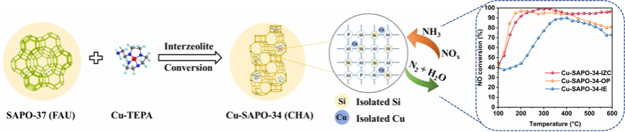 化学学院任利敏教授课题组长期致力于分子筛合成新路线的探索(Inorg. Chem. 2024, 63, 14539-14549; Ind. Eng. Chem. Res. 2024, 63, 15438−15447)。近日,大连理工大学任利敏教授、孟长功教授和沈阳师范大学殷成阳教授合作,在该研究领域取得了新的突破。通过选用具有高Si含量且主要为孤立硅分布的FAU型沸石SAPO-37为母体,并选用铜-四乙烯五胺(Cu-TEPA)同时作为铜源和有机结构导向剂,仅通过12-24小时快速由SAPO-37转晶制备得到Cu-SAPO-34。通过转晶策略使Cu-SAPO-34继承了母体沸石中的孤立硅分布,从而得到了适宜的酸性并优化了Cu2+物种的分布,与传统合成方法相比,Cu-SAPO-34展现出卓越的催化活性、更宽的温度窗口及更优异的水热稳定性。(图2)