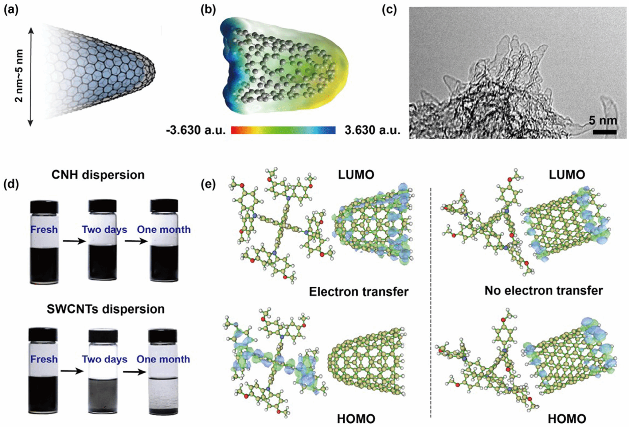 a) Structure of a single CNH, b) Charge distribution mapping, c) TEM image (scale bar: 5 nm), d) Dispersion of carbon materials in chlorobenzene, e) Charge transfer between CNH/Spiro-OMeTAD (left) vs. SWCNT/Spiro-OMeTAD (right).