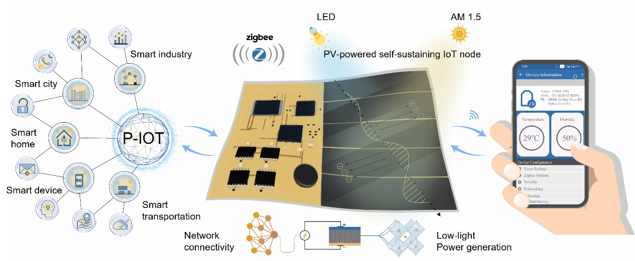 The current global Internet of Things (IoT) network has reached 17 billion nodes, primarily relying on wired power or batteries, which leads to high maintenance costs and risks of data loss during power outages. Although self-sustaining IoT nodes could resolve these issues, they face challenges such as unstable energy supply and insufficient energy utilization efficiency. Perovskite solar cells (PSCs) have emerged as an ideal energy solution for varying light conditions due to their tunable bandgap, high absorption coefficient, and excellent low-light efficiency (with a theoretical limit of 60%). However, existing photovoltaic systems still lack reliable power output in complex environments (e.g., dim indoor lighting or rainy weather) and suffer from insufficient integration of sensing, energy storage, and wireless transmission—hindering the practical development of self-sustaining IoT nodes.
