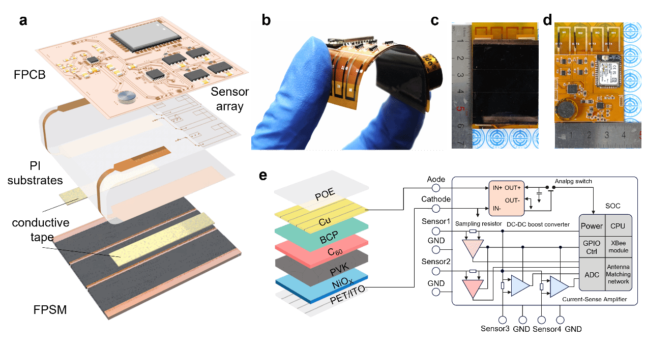 Recently, Prof. Shiyantao and Prof. Yin Bing’s research team at Dalian University of Technology developed a flexible perovskite solar module (FPSM)-powered self-sustaining sensor node (SSN) for IoT applications. The study employs a p-i-n perovskite heterojunction structure, encapsulated with polyolefin elastomer (POE) to enhance mechanical flexibility and environmental stability. The system integrates a dynamic maximum power point tracking (MPPT) algorithm and an adaptive energy storage module to optimize energy cycling efficiency. Furthermore, it incorporates PEDOT:PSS-based temperature/humidity sensors and low-power wireless communication to establish a wireless sensor network.